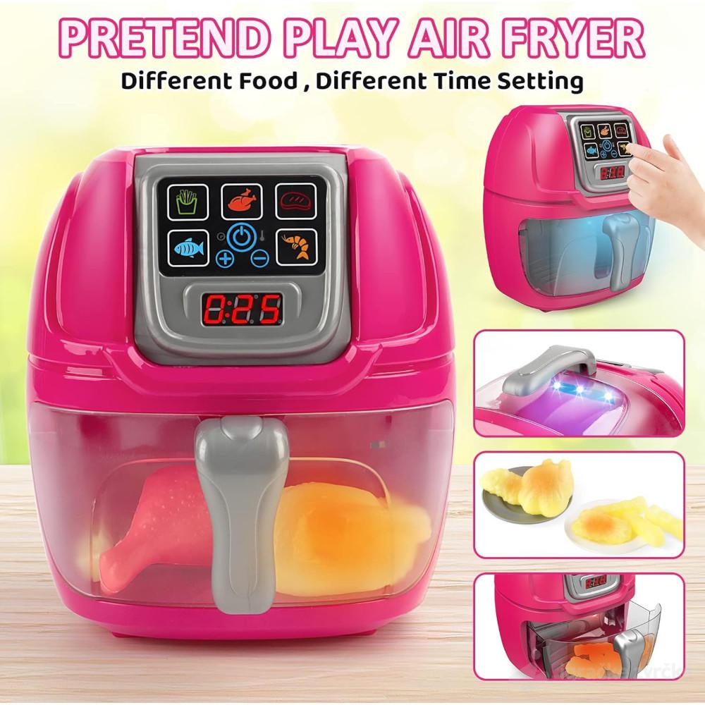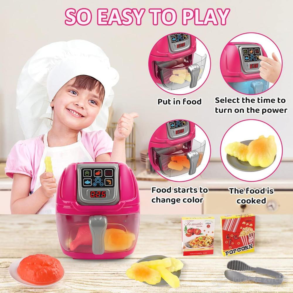 Kada dete stavi hranu unutra i uključi Air fryer, komadi počinju da menjaju boju, imitirajući proces pečenja. Uz fritezu dolaze hvataljke, plastični komadi hrane poput pomfrita, mesa, peciva i kutija za pakovanje.