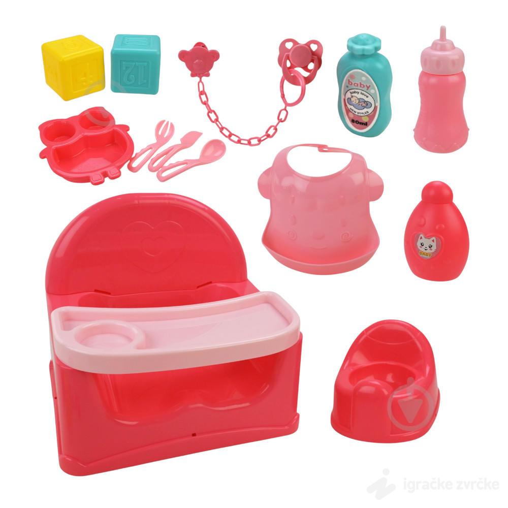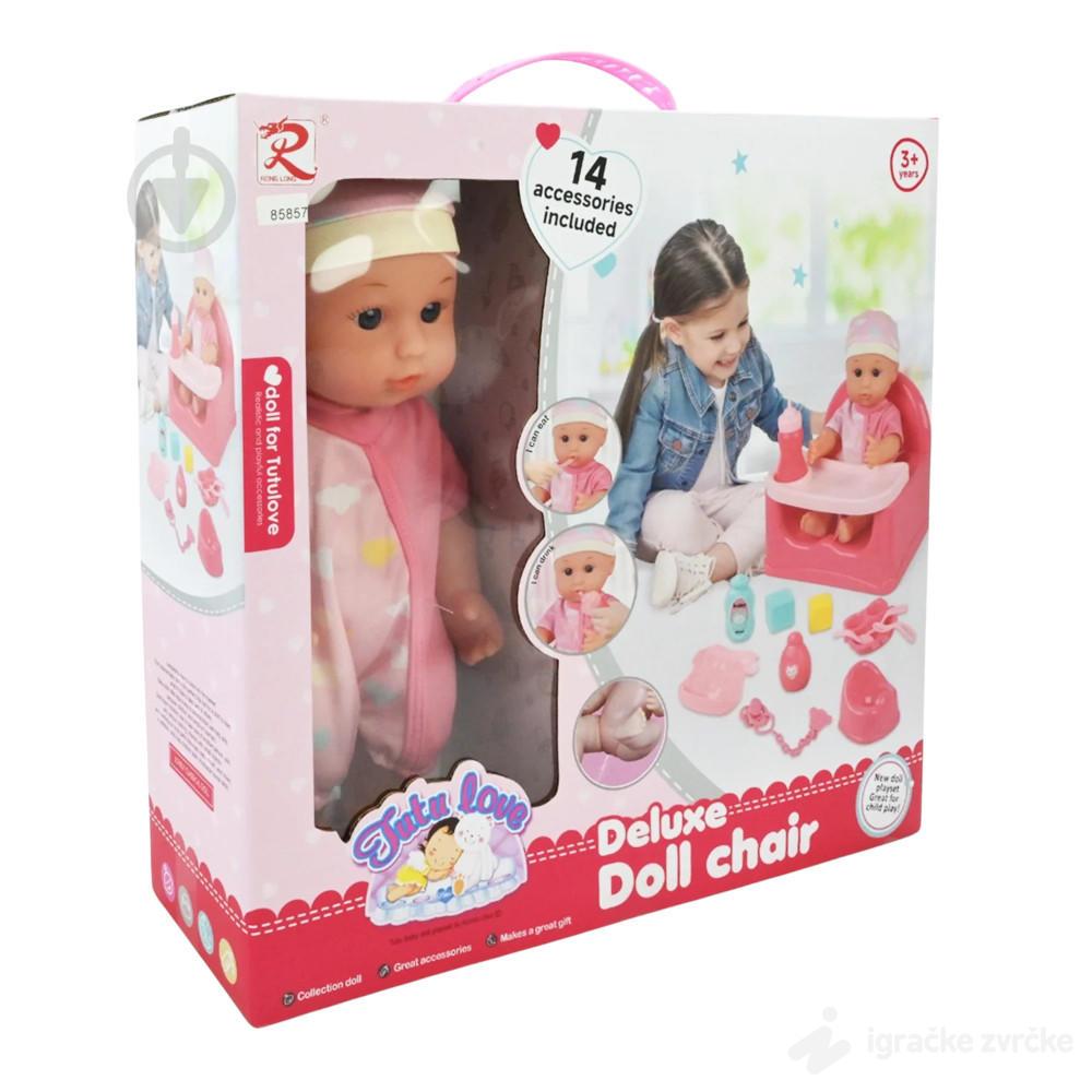 Ovaj Deluxe Doll Chair komplet pruža deci mogućnost da kroz igru brinu o svojoj lutki kao o pravoj bebi. Uz stolicu za hranjenje, pribor, flašicu, cucle, kockice i posudice, mališani razvijaju maštu, emocionalnu inteligenciju i osećaj odgovornosti.