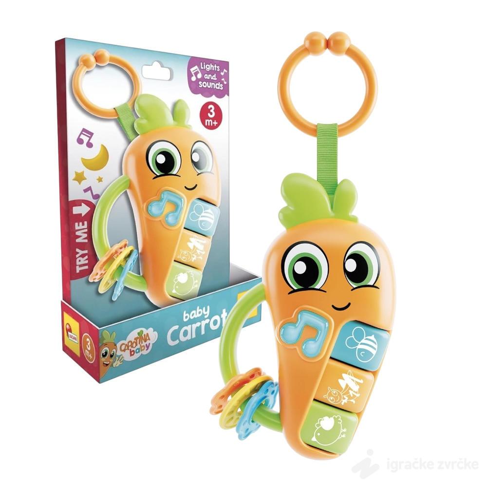 Baby Carrot je zabavna i vesela igračka u obliku šargarepe koja svetli, svira i ima zanimljive dugmiće za pritisak. Sa svojim šarenim bojama, osmehom i prstenom za kačenje, lako postaje omiljeni saputnik vaše bebe – kod kuće, u kolicima ili na putu.