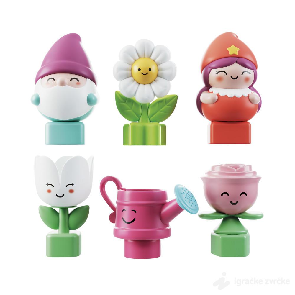 Set simpatičnih figurica vilenjaka i cveća donosi veselu igru punu boja i oblika. U kompletu se nalaze figure vilenjaka, cvetića i zalivajuće kantice, koje se slažu na postolje sa odgovarajućim otvorima. Igra je namenjena mališanima od 10 meseci i idealna je za prve korake u učenju logike, boja i fine motorike.