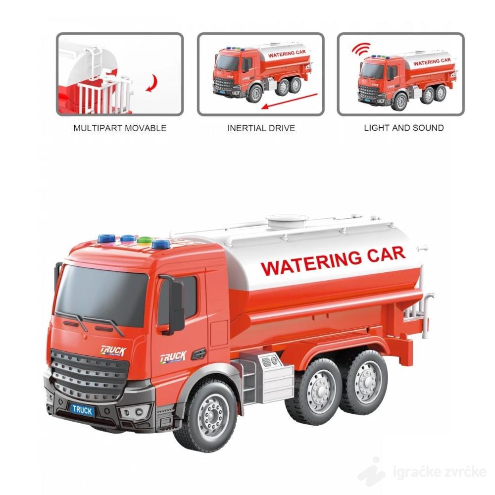 Kamion–cisterna Watering Car je prava zvezda dečijih igara sa vozilima. Sa svojim upečatljivim crveno–belim dizajnom i realističnim detaljima, izgleda kao pravi kamion koji svakog dana radi na ulicama. Deca mogu da uživaju u igri zahvaljujući pokretnim delovima, dok svetlosni i zvučni efekti dodatno pojačavaju doživljaj. Posebna prednost je pogon na inerciju – dovoljno je povući ga unazad i pustiti da sam jurne napred, što čini igru još zabavnijom i dinamičnijom.