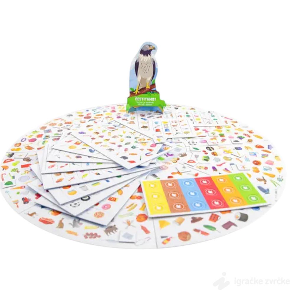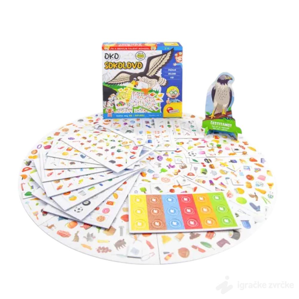 Oko Sokolovo je edukativna društvena igra koja pomaže deci da izoštre vid, pažnju i brzinu zapažanja. Cilj igre je da se što brže pronađu iste sličice na velikoj tabli i karticama.