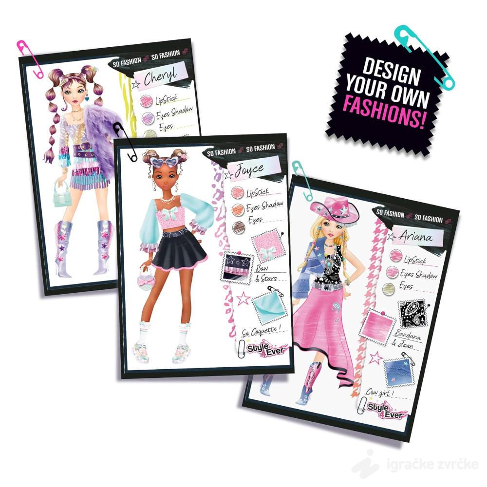 Set sadrži šablone, grafičke listove, stikere, mini tkanine, olovke i preko 35 različitih dodataka koji čine proces stvaranja zabavnim i jednostavnim.