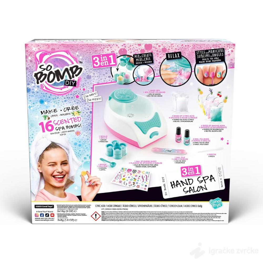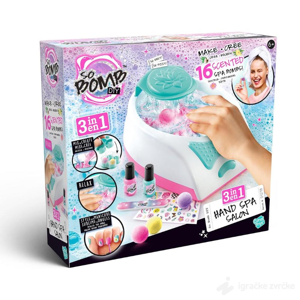 So Bomb DIY 3u1 Hand Spa Salon je komplet koji deci donosi kombinaciju kreativnosti, lepote i opuštanja. Uz pomoć jednostavne mašinice, šarenih praškova i kalupa, mališani lako mogu napraviti svoje mirisne spa bombice.