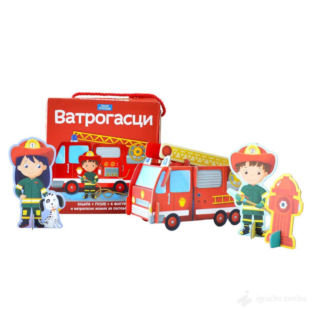 Kutija puna zabave i učenja, sadrži knjižicu od 10 strana, slagalicu od 40 delova, 4 figure koje možete sklopiti i postaviti na slagalicu i vatrogasno vozilo za sklapanje.