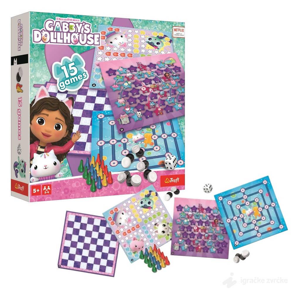Ovaj bogati set donosi čak 15 različitih društvenih igara inspirisanih popularnim Gabby's Dollhouse svetom. U pakovanju se nalaze različite table, figure, kockice i dodatci koji omogućavaju raznovrsnu igru i sate zabave.