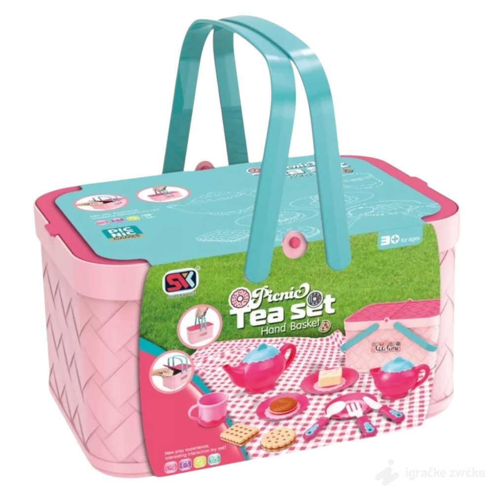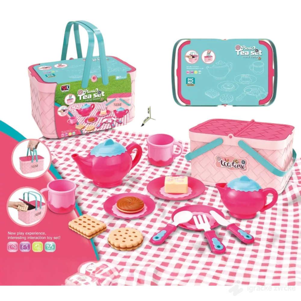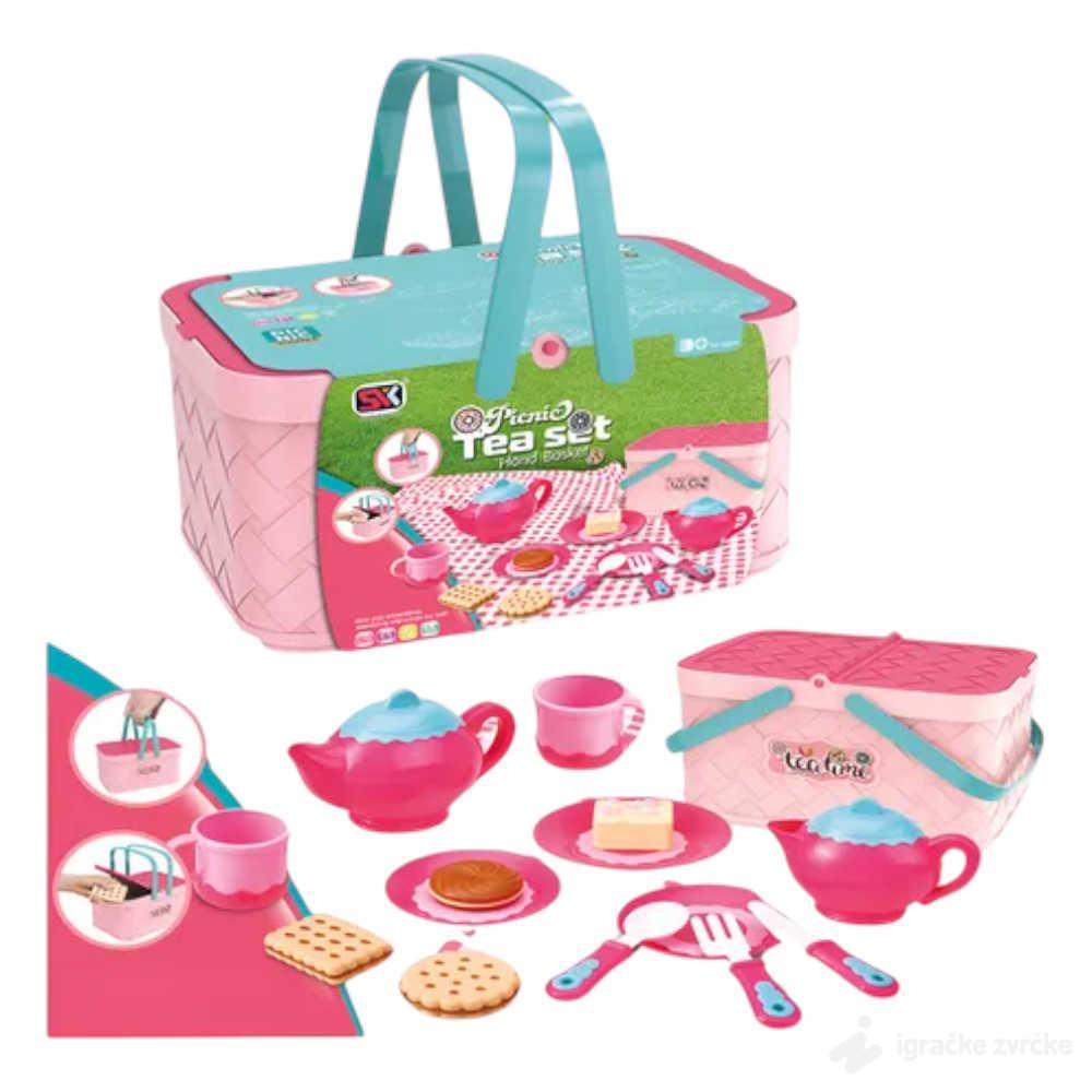 Ovaj preslatki piknik tea set donosi pravo malo iskustvo druženja uz čaj. U praktičnoj korpi nalaze se čajnik, šolje, tanjiri, pribor i dekorativni kolačići koji igru čine još realističnijom. Sve se lako spakuje nazad u korpu, pa dete može poneti set gde god poželi – u sobu, dvorište ili na izlet.