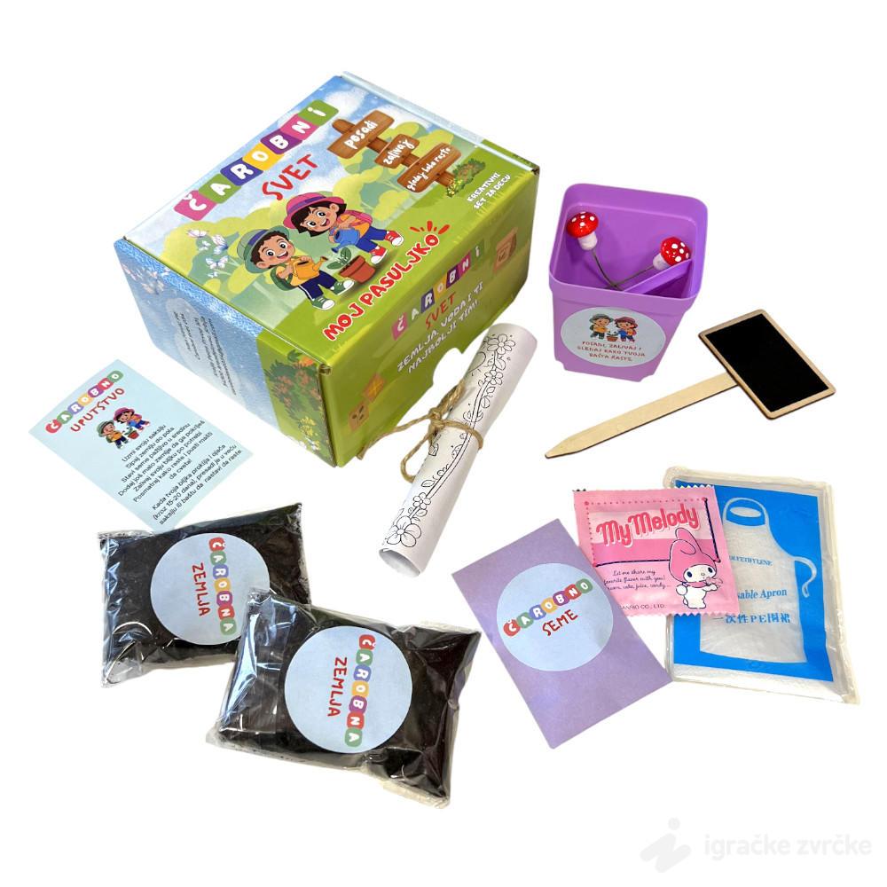 Kreativni set Moj Pasuljko omogućava deci da sama zasade pasulj i posmatraju kako biljka raste. Set sadrži sve potrebno za mali kućni eksperiment – saksiju, zemlju, seme i razne dodatke.