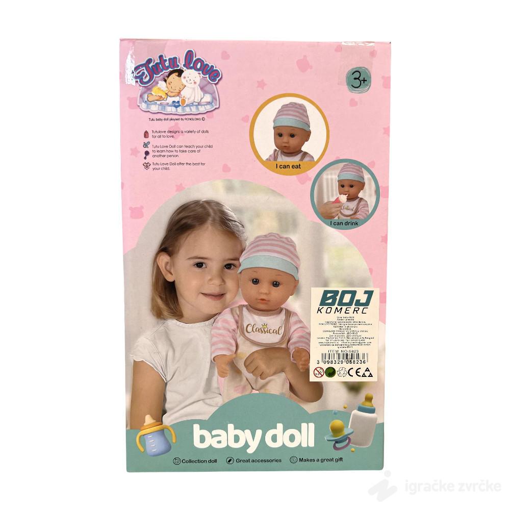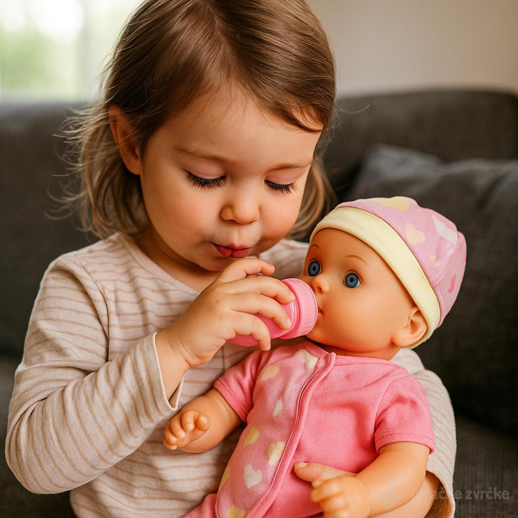 Ova preslatka beba lutka od 30 cm dolazi u mekanom roze outfitu sa šarenim srdašcima i kapicom, kao i flašicom za hranjenje. Lutka može da „jede“ i „pije“, što igru čini realističnijom i još zabavnijom za mališane. Namenjena je deci uzrasta od 3+ godine i idealna je za sve male mame i tate koji vole igru uloga i negu svojih bebica.