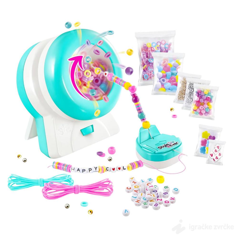 Set uključuje više od 600 elemenata: perle, slova, šarene konce, priveske i dodatke za izradu. Deca biraju boje, ubacuju perlice u mašinu i gledaju kako se narukvica sklapa dok se spinner okreće – rezultat su razigrani, personalizovani ukrasi koje mogu da nose ili poklone drugarima.