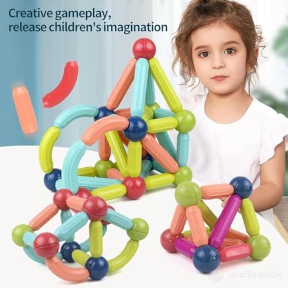 Magnetni set sa štapićima i kuglicama namenjen je deci koja vole da istražuju, grade i stvaraju. Zahvaljujući jakim magnetima, elementi se lako povezuju i omogućavaju pravljenje različitih konstrukcija, oblika i figura.