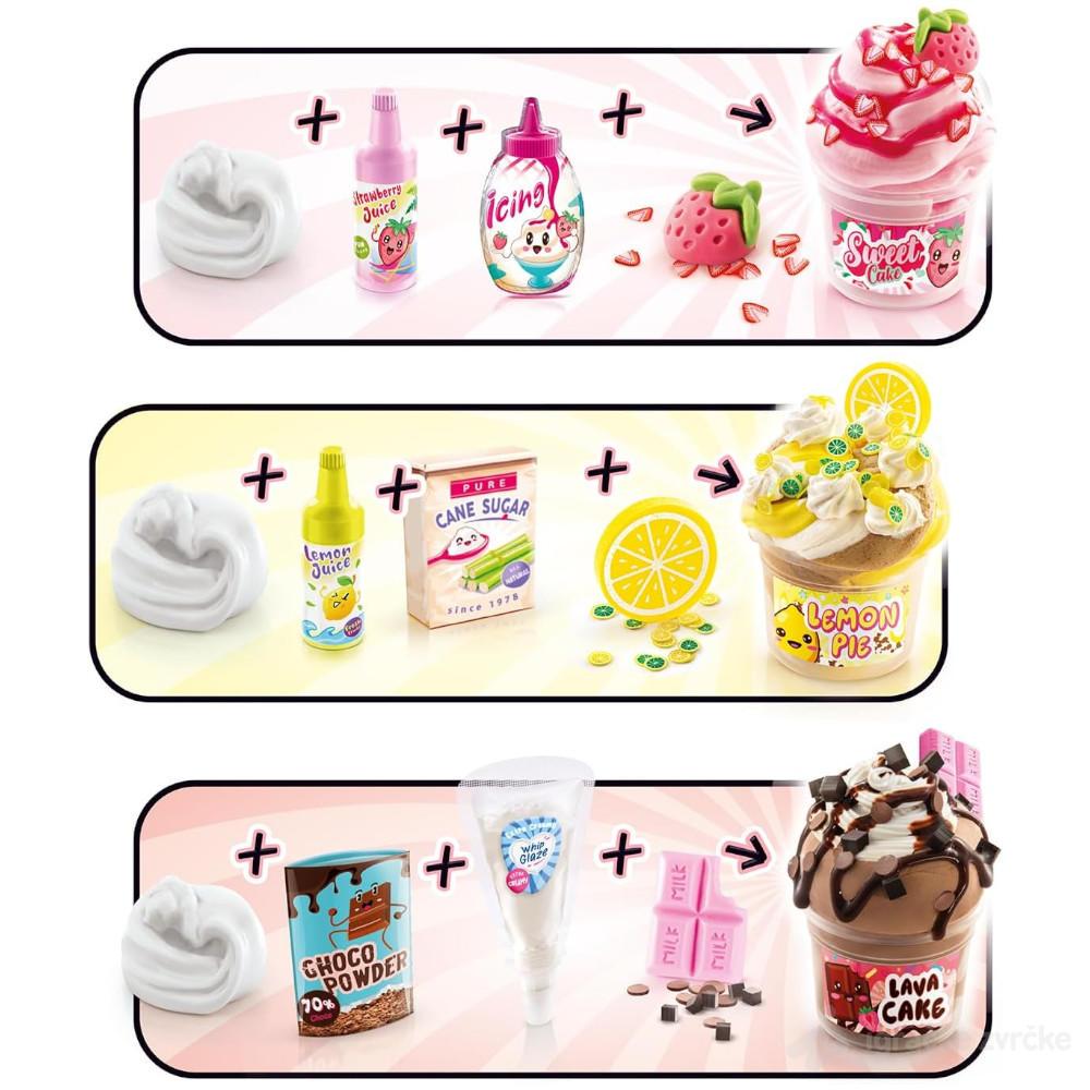 Dodavanjem boja, „preliva“, dekoracija i raznih dodataka, mališani dobijaju potpuno nove teksture i efekte u slajmu. Set sadrži mikser, posudicu, više vrsta „sastojaka“, ukrase, 3 recepta i čašice za finalne kreacije.