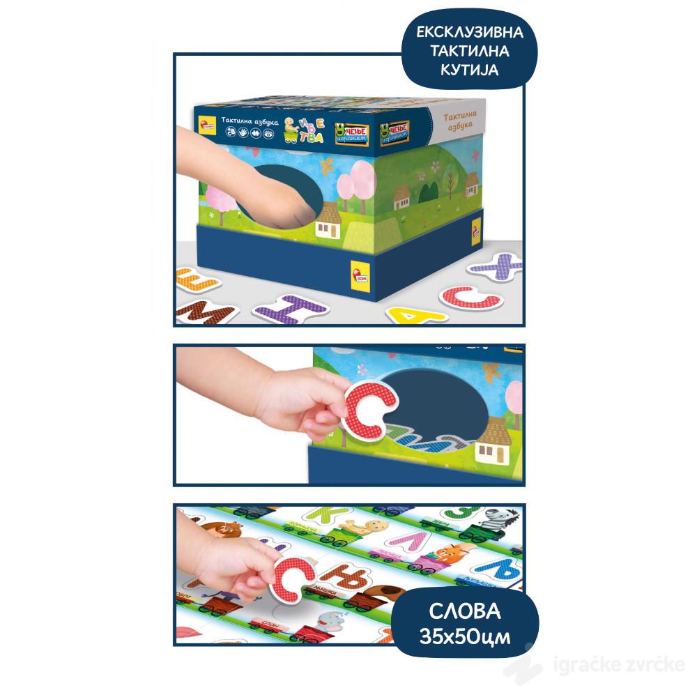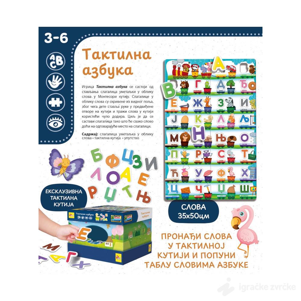 Fantastični setovi za igru po Montessori metodi. Montessori Taktilna Azbuka edukativna igra je sjajan način da se Vaše dete igra dok ujedno uči i vežba svoja čula i razmišljanje. Ova igra se igra tako što se tabla sa izrezanim slovima i slova stave u Montesori kutiju. Zatim dete treba da sedne i stavi ruke unutra.