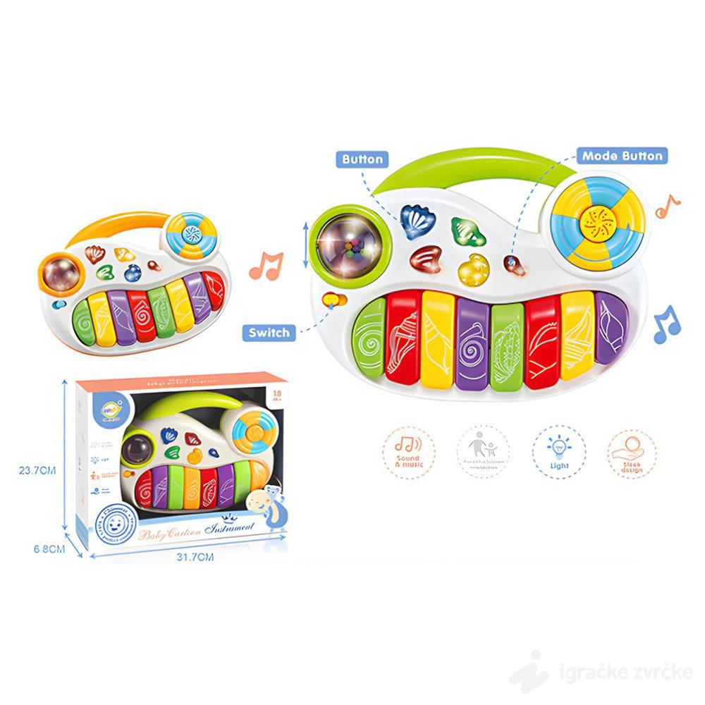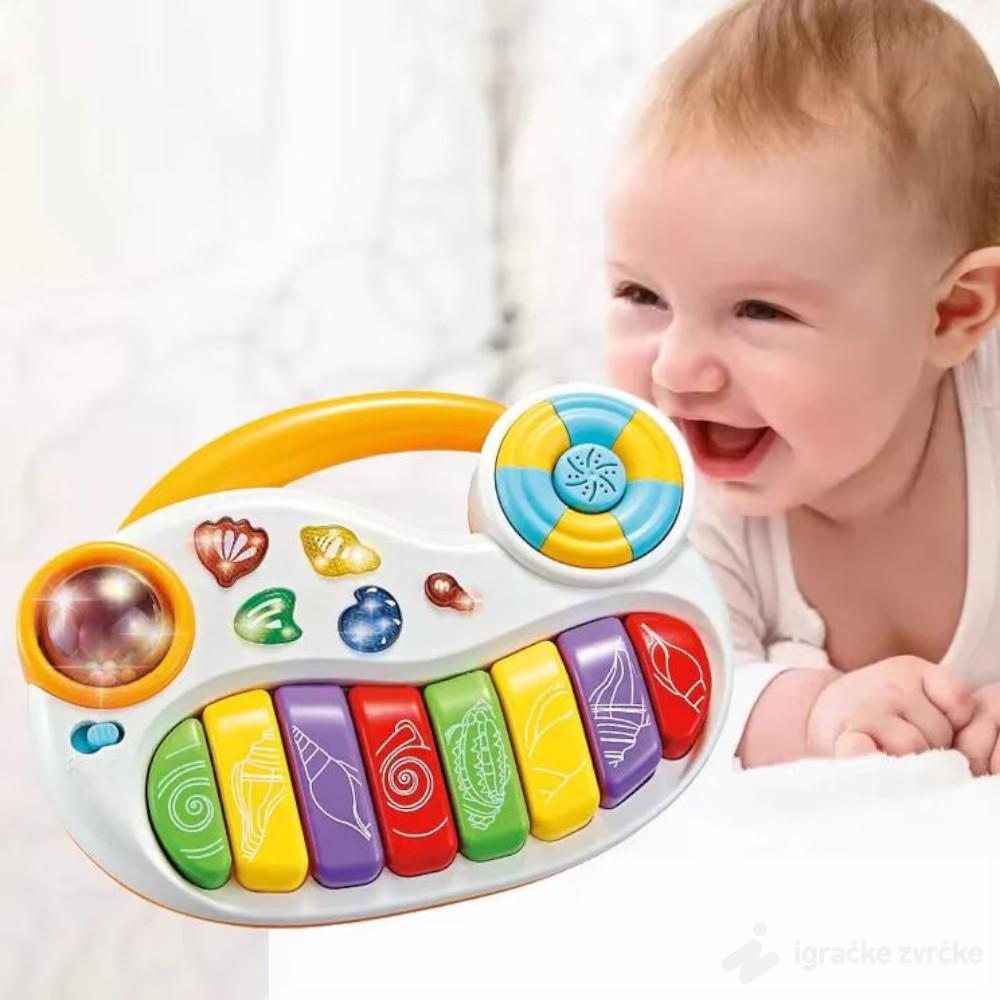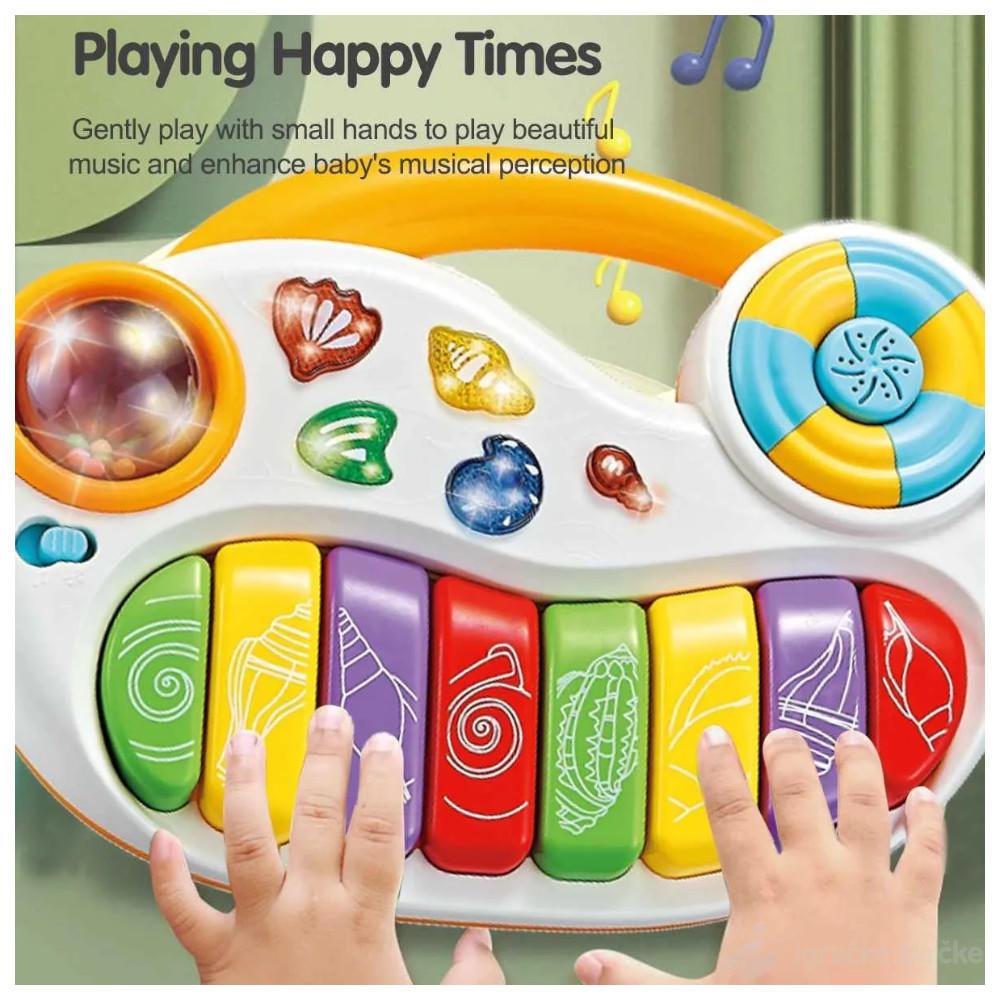 Ove preslatke interaktivne klavijature za bebe donose spoj boja, zvukova i svetla, savršeno prilagođeno najmlađima. Velike dirke u duginim bojama, ukrašene oblicima školjki, podstiču dete da eksperimentiše i otkriva različite tonove.