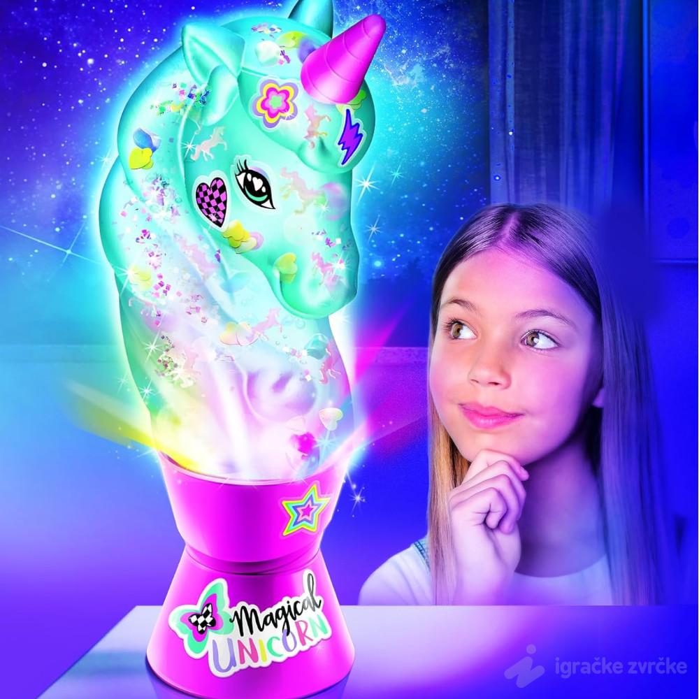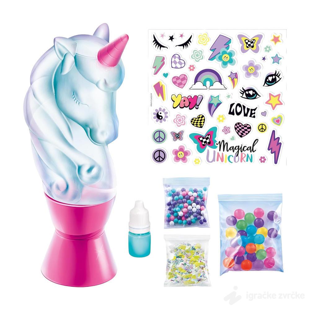 Ovaj kreativni set omogućava deci da sama naprave i ukrase svoju Unicorn lava lampu. Kroz jednostavan i zabavan proces, dete dodaje vodu, perlice i boju, a zatim dekorše lampu nalepnicama po sopstvenoj želji.