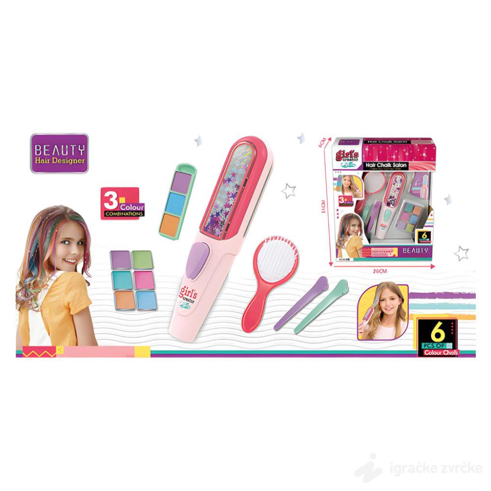 Ovaj set je odličan izbor za devojčice koje vole da eksperimentišu sa frizurama i bojama. Privremene kredice za kosu omogućavaju promenu izgleda bez trajnog farbanja, što ga čini bezbednim i praktičnim.