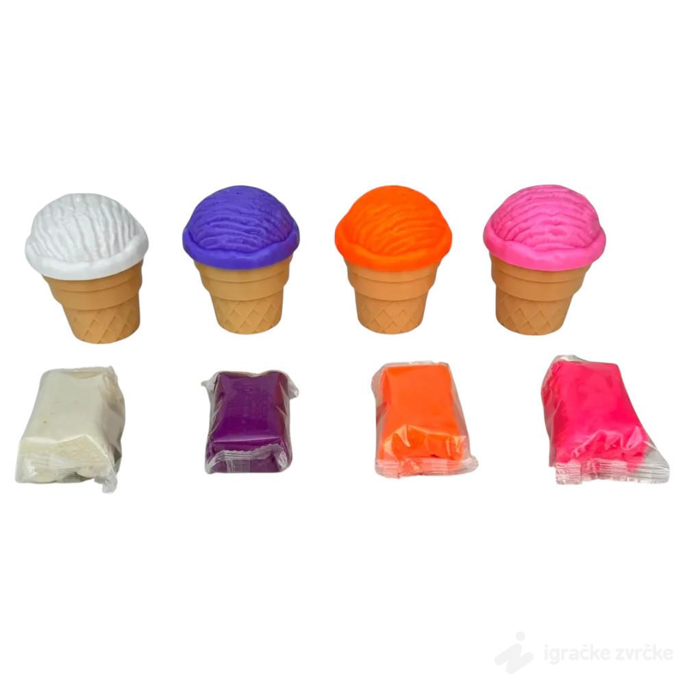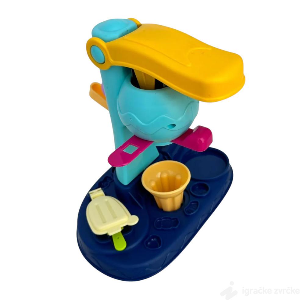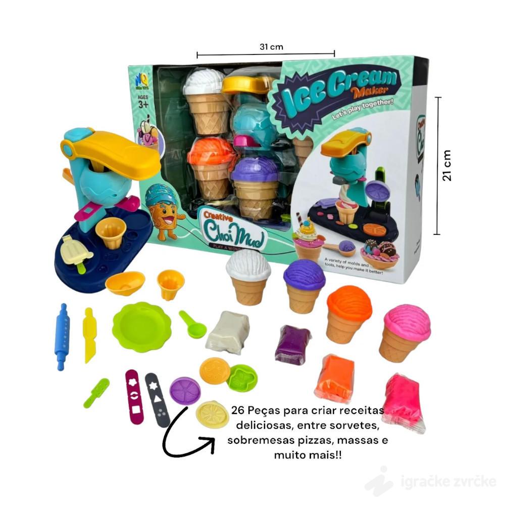 Ovaj kreativni set za pravljenje sladoleda od plastelina pretvara igru u pravu malu poslastičarnicu. Deca mogu koristiti mašinu za sladoled da „prave“ sladolede različitih boja i tekstura, zatim da ih dekorišu kalupima i priborom koji dolazi u setu.