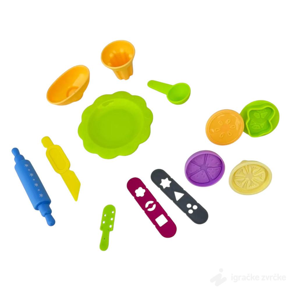 U pakovanju se nalazi ukupno 26 elemenata, uključujući kornete, kalupe, valjak, pribor, kao i više paketića plastelina u živim bojama. Mašina je jednostavna za korišćenje, a sve je dizajnirano tako da podstakne maštu, kreativno izražavanje i otvorenu igru.
