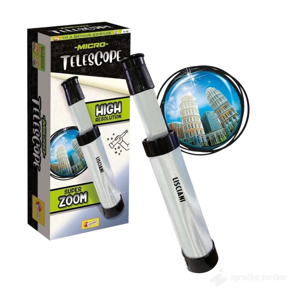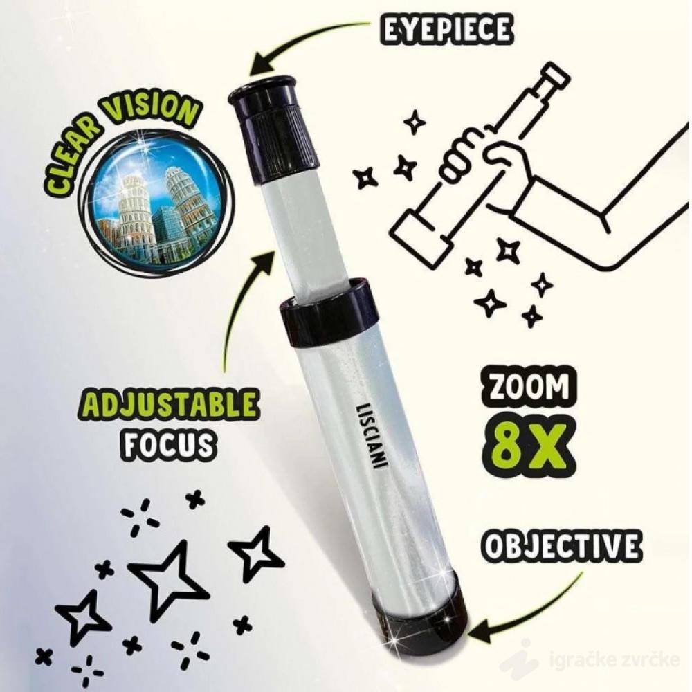 Mali istraživači sada mogu da zavire u svet dalekih prizora uz Lisciani Micro Teleskop. Ova kompaktna i lagana spravica nudi 8x uvećanje, jasan prikaz i lako podesiv fokus, pa dete može da se igra istraživača bilo kod kuće, u dvorištu ili na putovanju. Sa ovim teleskopom svaki krov, drvo ili brdo postaje nova avantura za posmatranje.