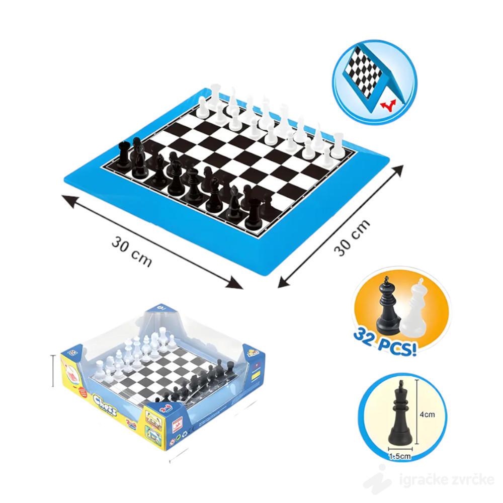 Ovaj šahovski set predstavlja savršen izbor za sve ljubitelje klasičnih društvenih igara. Tabla dimenzija 30x30 cm i komplet od 32 figure omogućavaju potpunu igru bilo gde – kod kuće, u školi ili na putovanju.