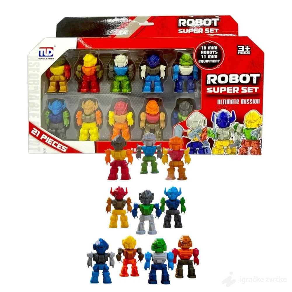 Ovaj zabavni set mini robota donosi uzbudljivu igru kroz raznovrsne figure u jarkim bojama. Svaki robot ima poseban dizajn, što omogućava deci da kreiraju sopstvene priče, borbe i avanture. Kompaktan format čini ih lakim za nošenje i igranje bilo gde.