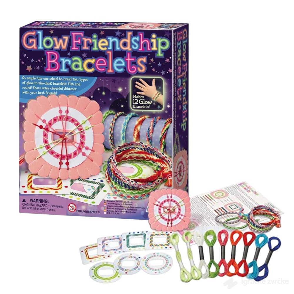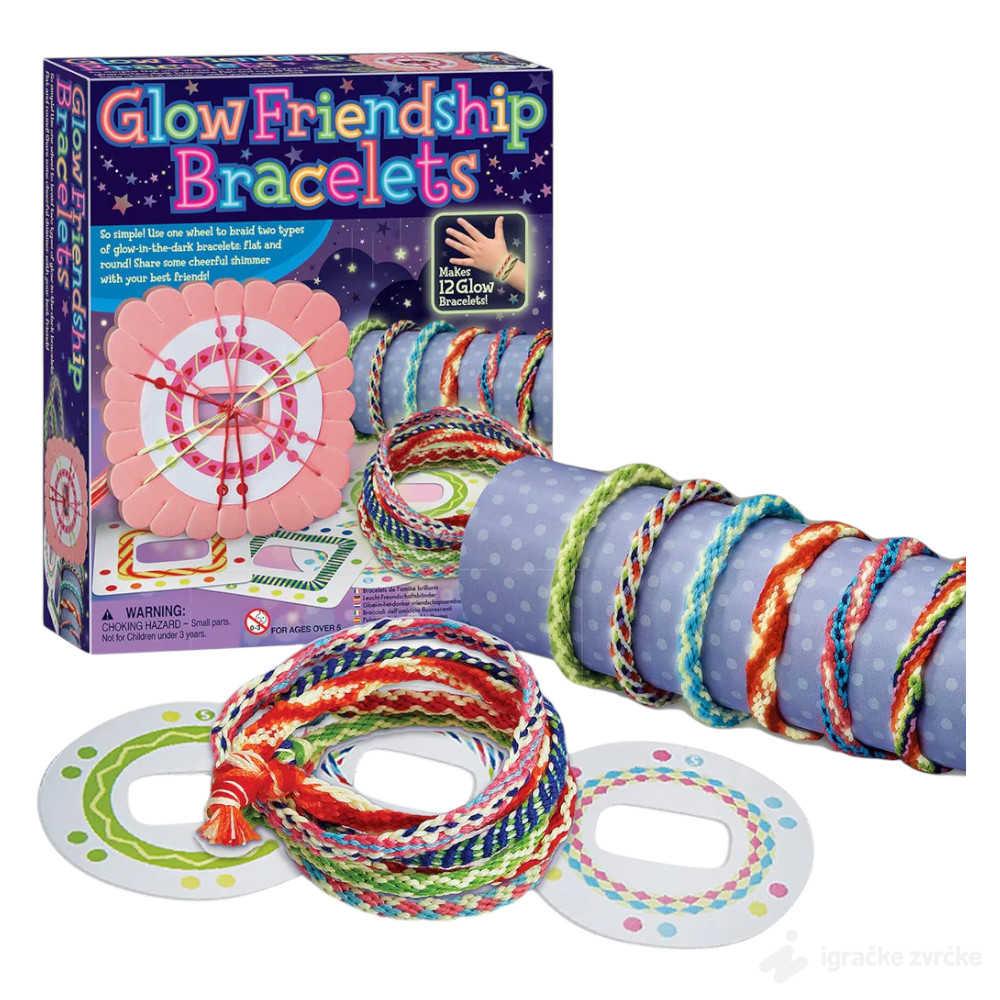 Ovaj zabavni kreativni set omogućava deci da naprave sopstvene narukvice prijateljstva koje svetle u mraku.