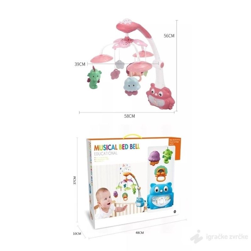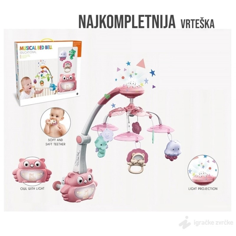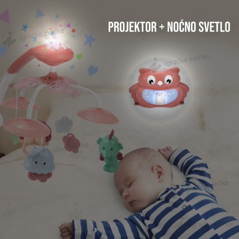 Vrteška za krevetac sa projektorom SOVA je najlepša vrteška u pastelnim bojama. Muzička vrteška na baterije će svojom nežnom muzikom uspavati i umiriti Vaše dete.