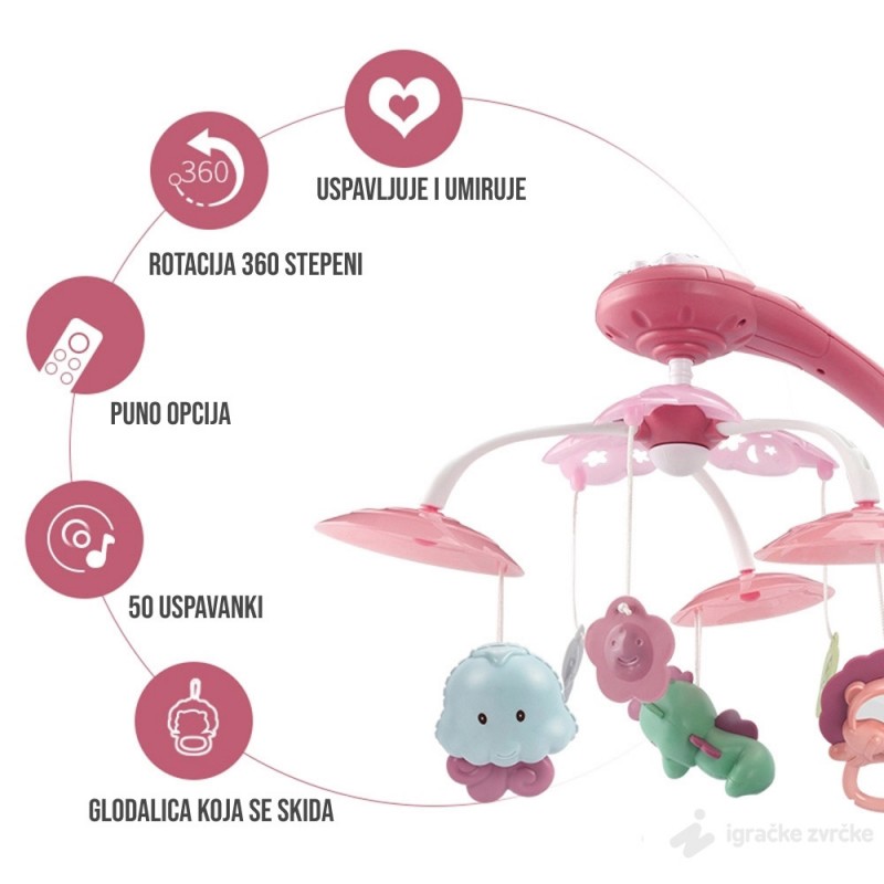 - Kada je budna, beba će biti zabavljena oblicima i bojama i neće joj biti dosadno - Pored melodija, ova vrteška za krevetac ima i zabavne zvukove - Projektor pravi razne oblike i sličice koje beba prati