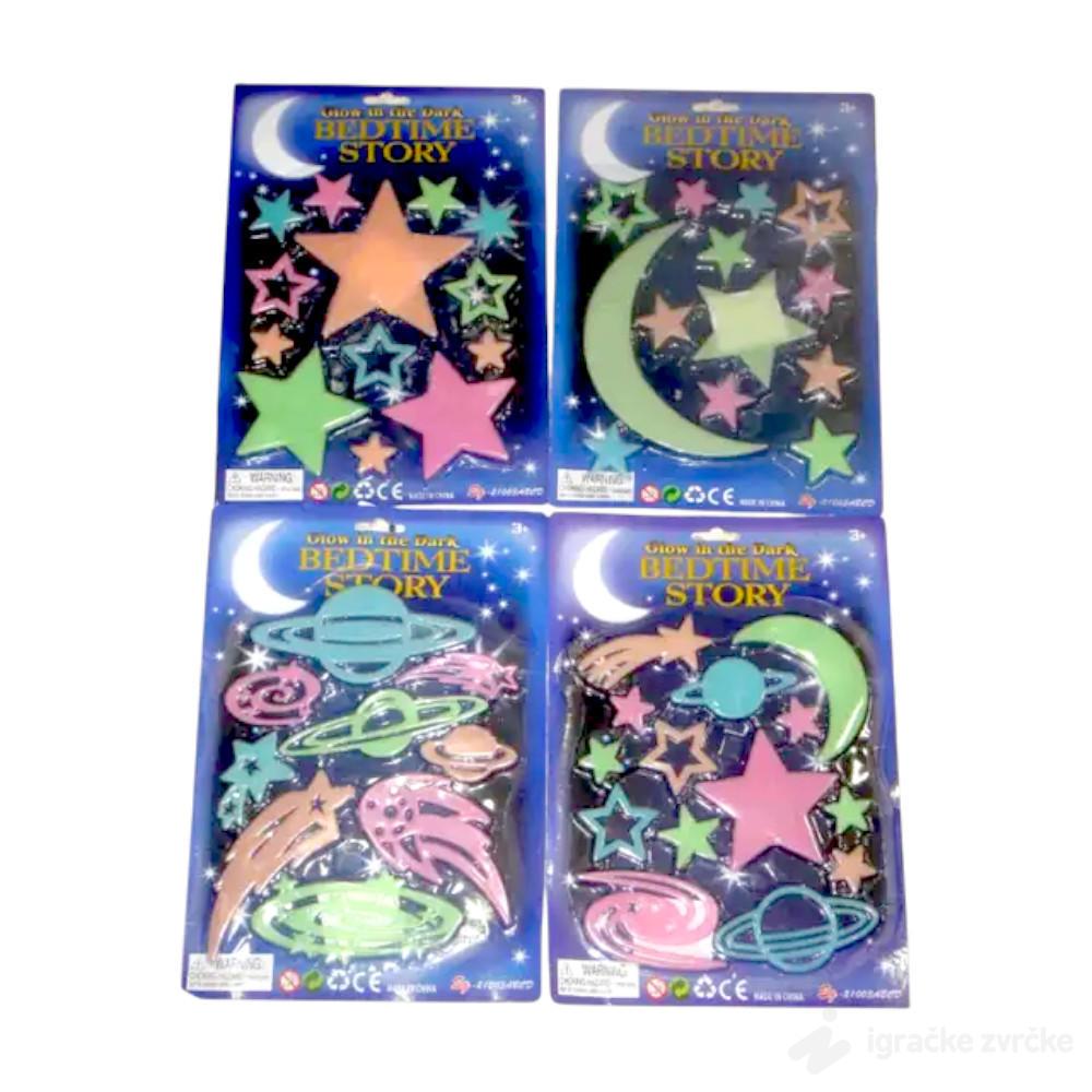 Glow in the dark dekorativni set sa zvezdama, mesecom i svemirskim oblicima pretvara dečju sobu u čarobno noćno nebo. Tokom dana se pune svetlom, a u mraku nežno svetle i stvaraju umirujući ambijent.